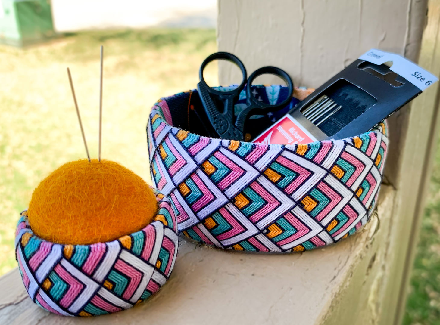 Design: Pincushion: 4.5cm x 4.5cm x 4cm (1.75″ x 1.75″ x 1.5″); Tray: 8cm x 8cm x 4cm (3.25″ x 3.25″ x 1.5″)